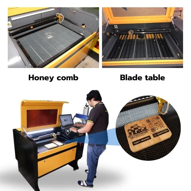 2. โต๊ะสำหรับเลเซอร์ มีให้ถึง 2 แบบ - โต๊ะแบบใบมีด Blade table เหมาะกับงานตัดชิ้นงานที่ไม่ละเอียดมาก - โต๊ะตัดแบบรังผึ้ง Honey comb เหมาะกับงานตัดที่ละเอียดๆ