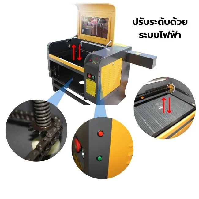 เครื่องแกะสลักเลเซอร์ รุ่น LRT-4060+ สามารถปรับระดับโต๊ะเลเซอร์ขึ้นลงได้ถึง 30 ซม. เพียงกดปุ่มมอเตอร์ไฟฟ้า จะทำการขับโซ่ และโซ่จะพ่วงกับ Pulley เพื่อปรับโต๊ะขึ้นลงแบบละเอียดทีละ 0.1 มม จะทำให้การปรับโฟกัส ระหว่างหัวเลเซอร์ Head ซึ่งเป็นต้นกำเนิดแสง กับตัววัสดุได้อย่างละเอียดแม่นยำ
