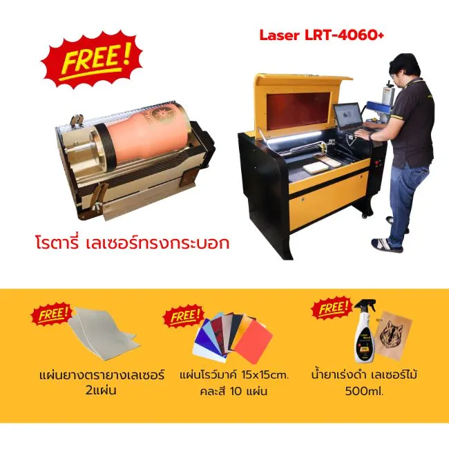 เครื่องเลเซอร์ตัด/แกะสลัก Laser LRT4060+ ระบบ CO2 ฟังก์ชันการทำงานแบบ 5 In 1 ตัด / แกะสลัก /ยิงลอกสี / เลเซอร์ไม้ดำ Super black / เลเซอร์ทรงกระบอก เครื่องเดียวคุ้มค่า พื้นที่การทำงาน 400*600mm. เลเซฮร์งานหลากหลาย ไม้ อะคริลิค หนัง ผ้า แก้ว กระจก เซรามิก และอื่นๆ